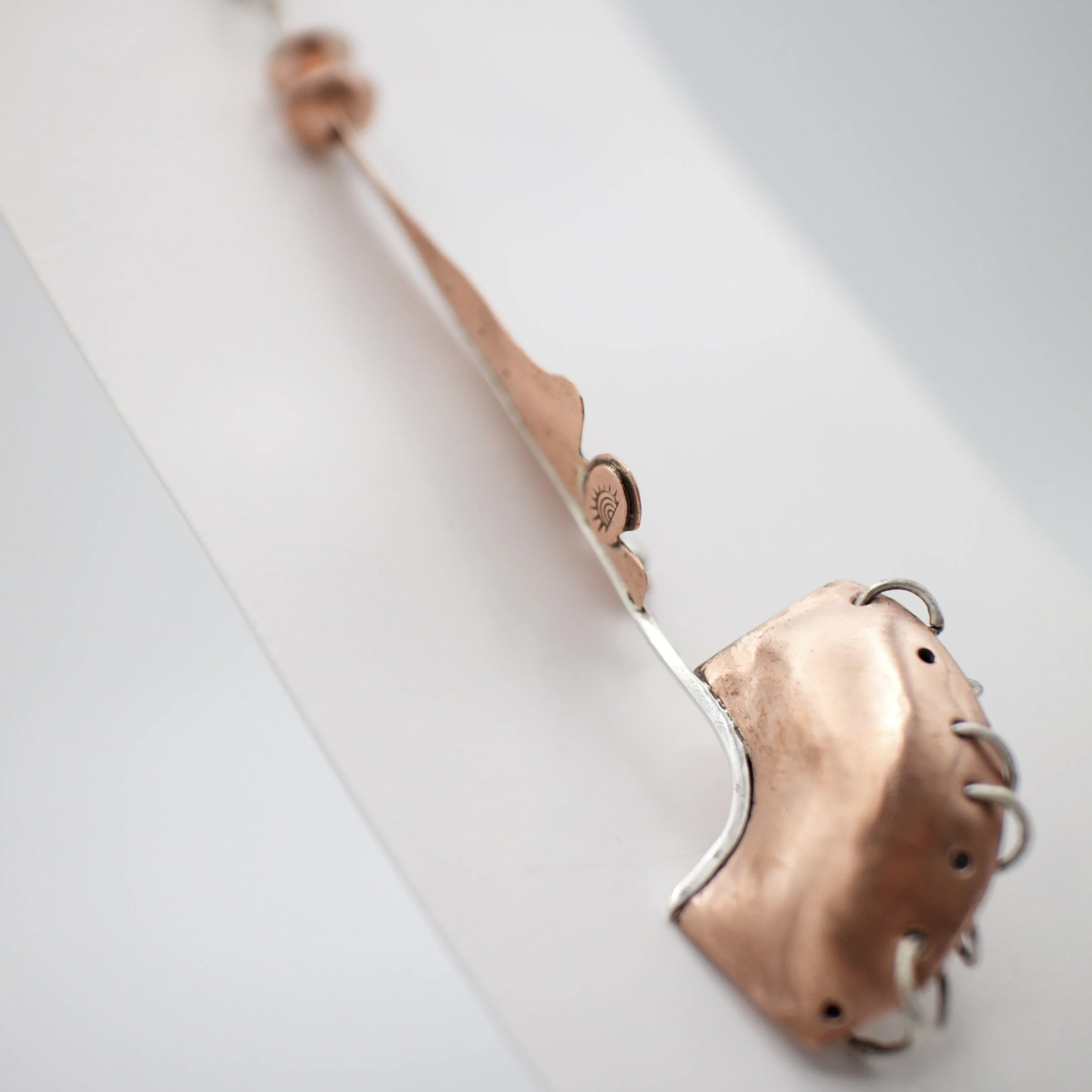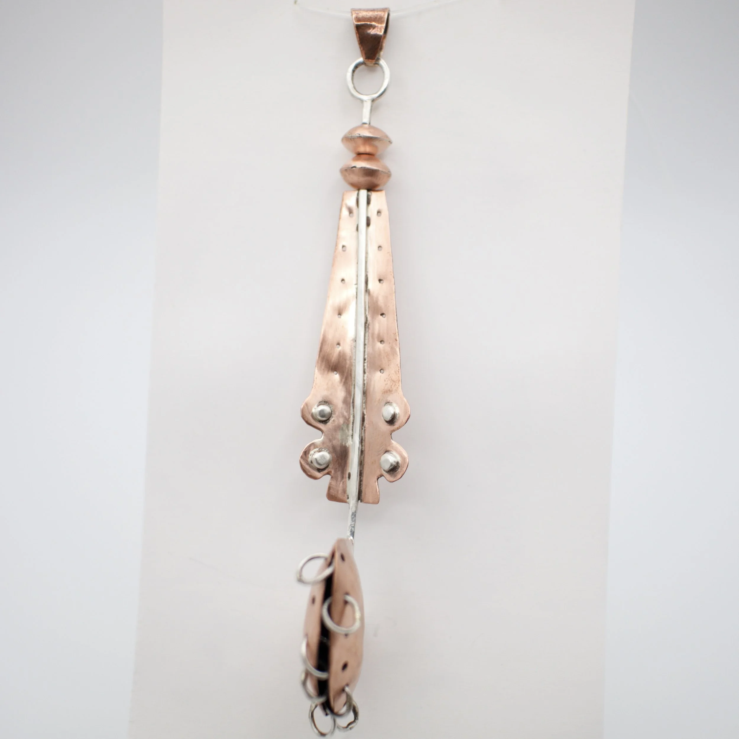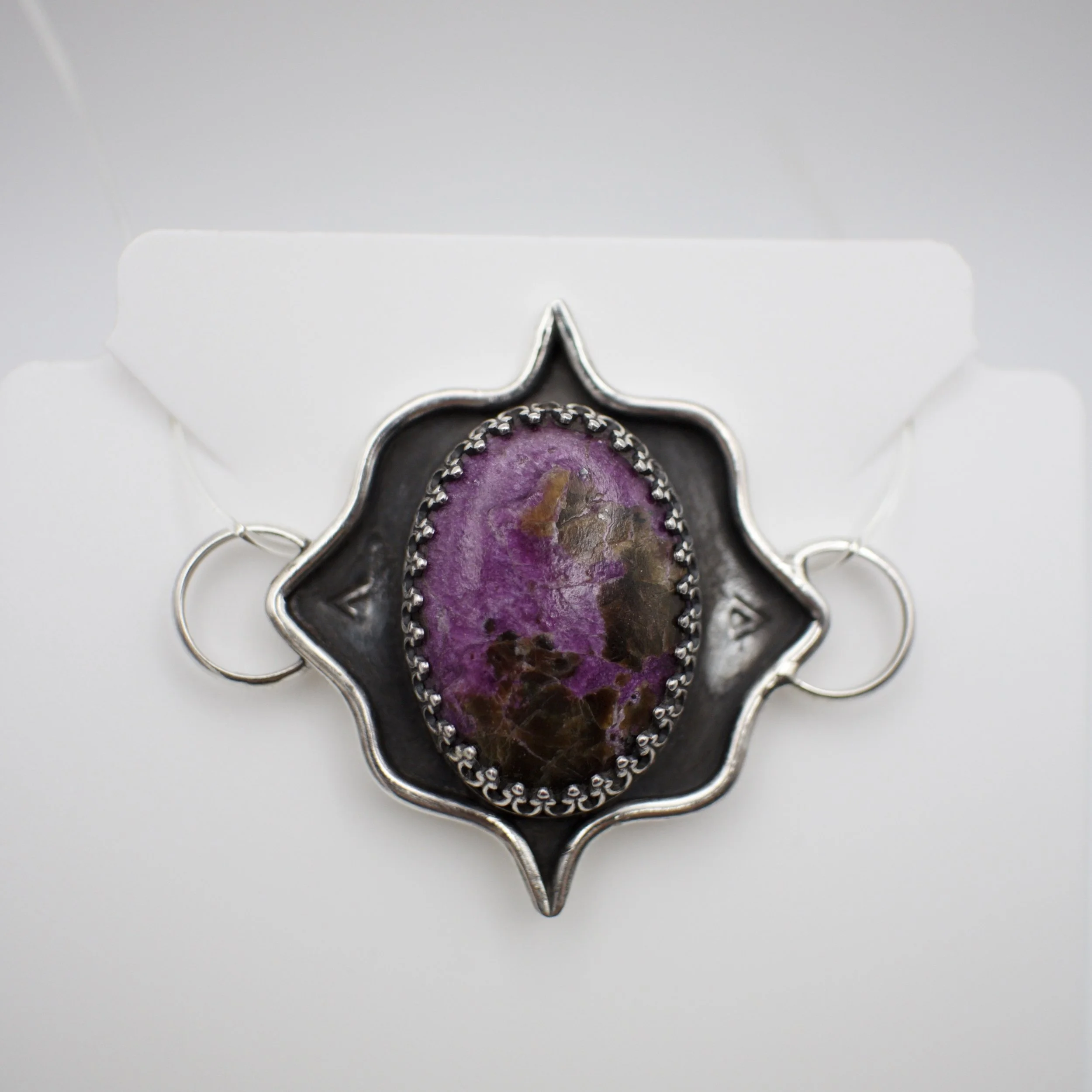 Stunning statement pendant with two side-links. Three malachite cabochons with intricate silver cutouts and serrated bezel.