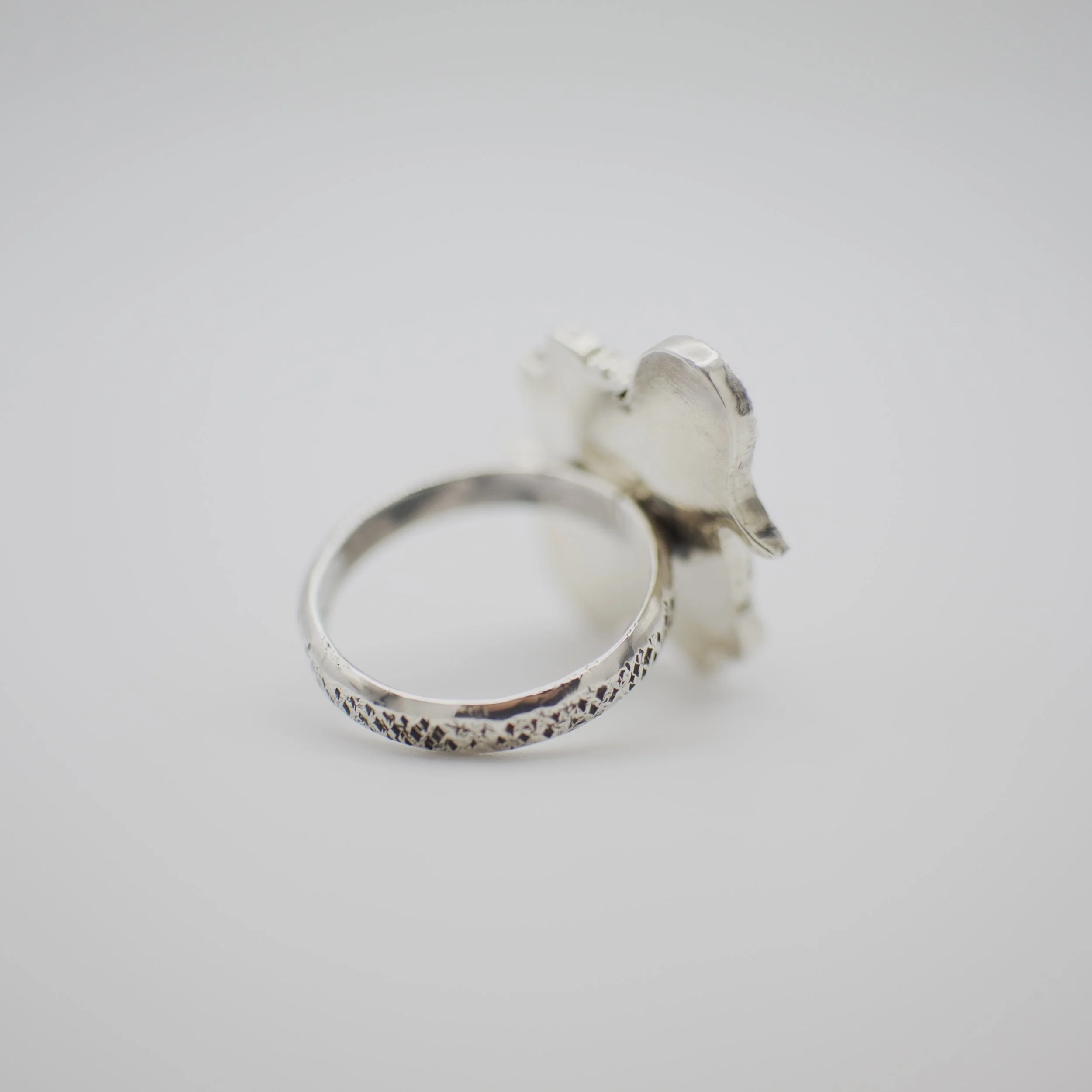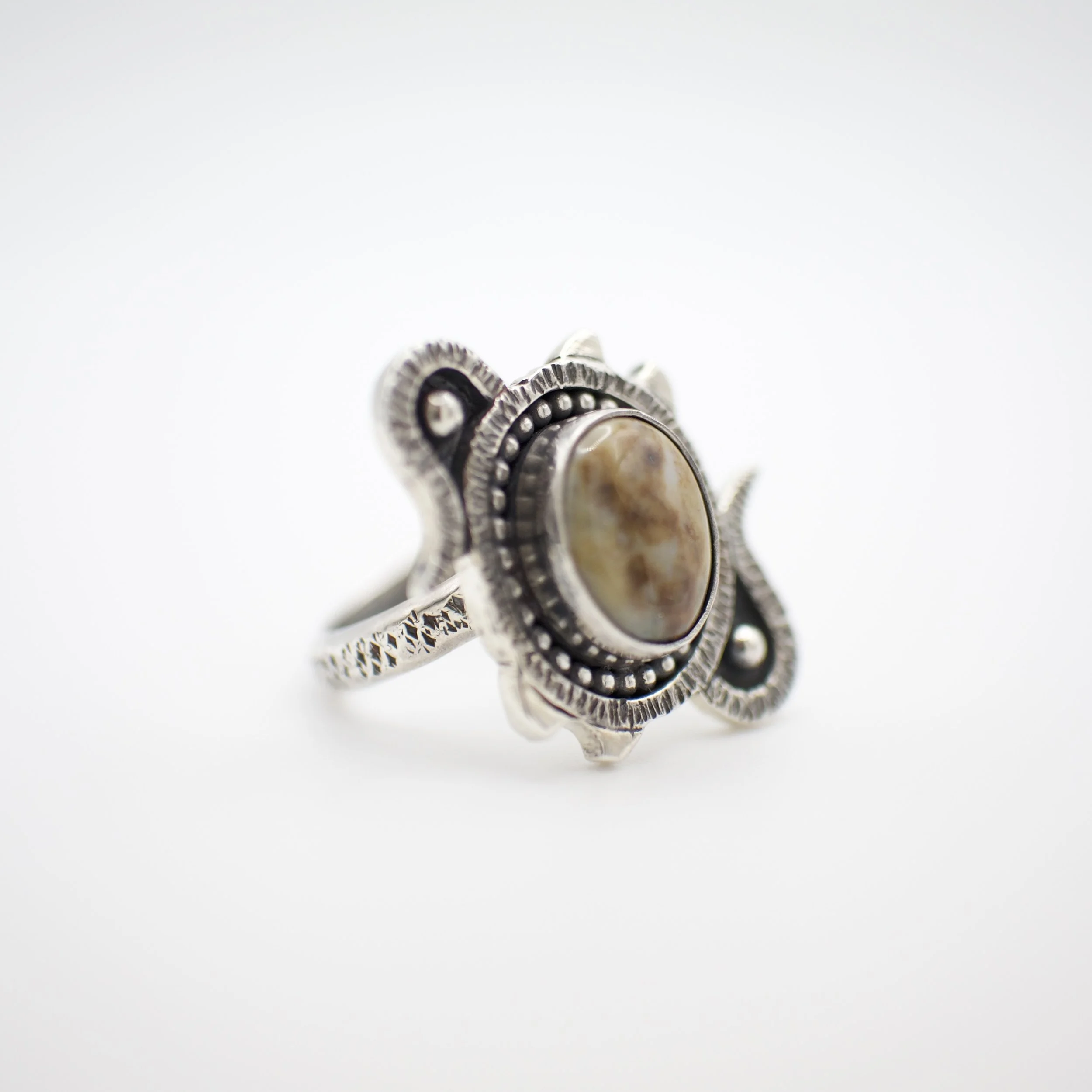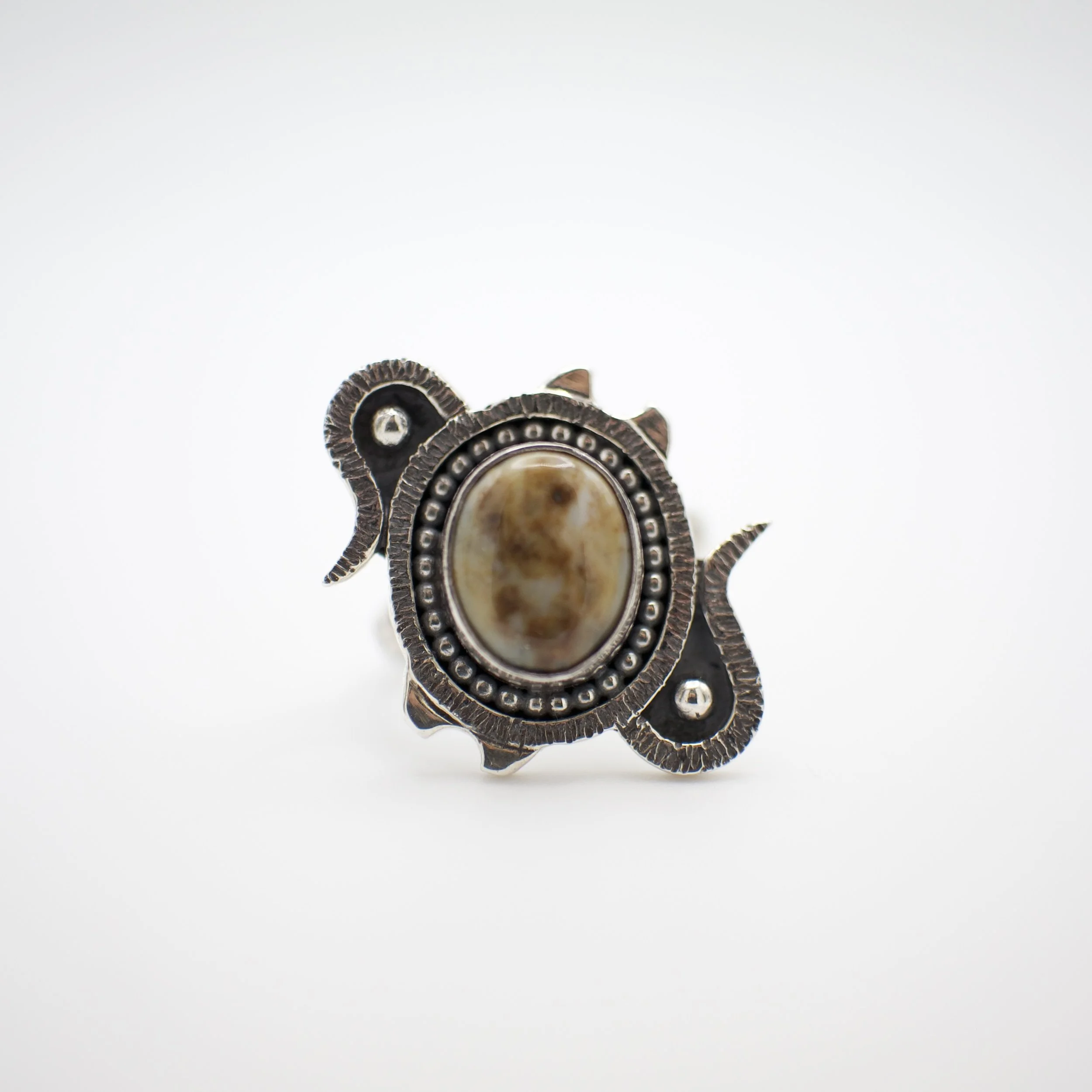 Ocean Jasper cabochon with tentacle and beak design. Band is textured.