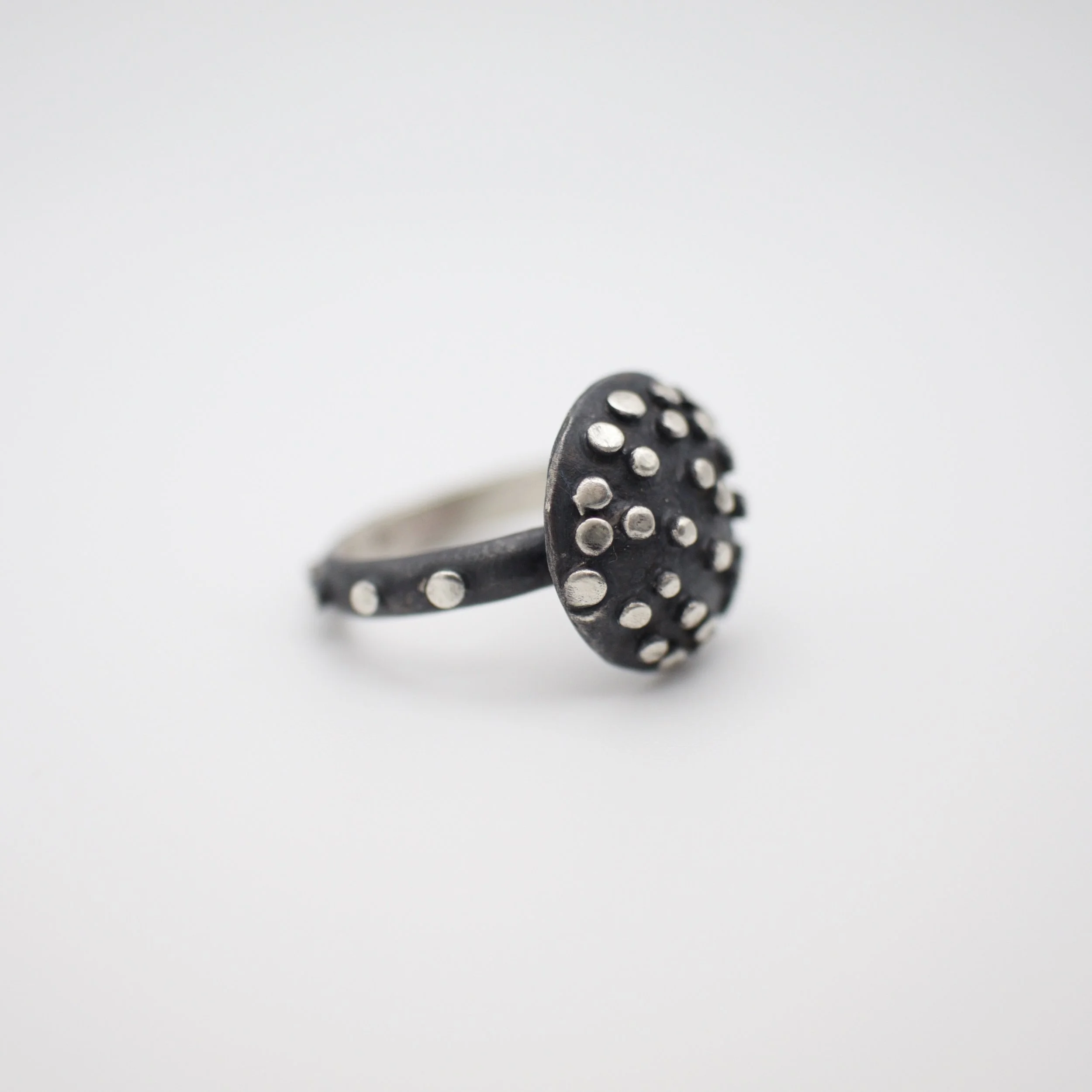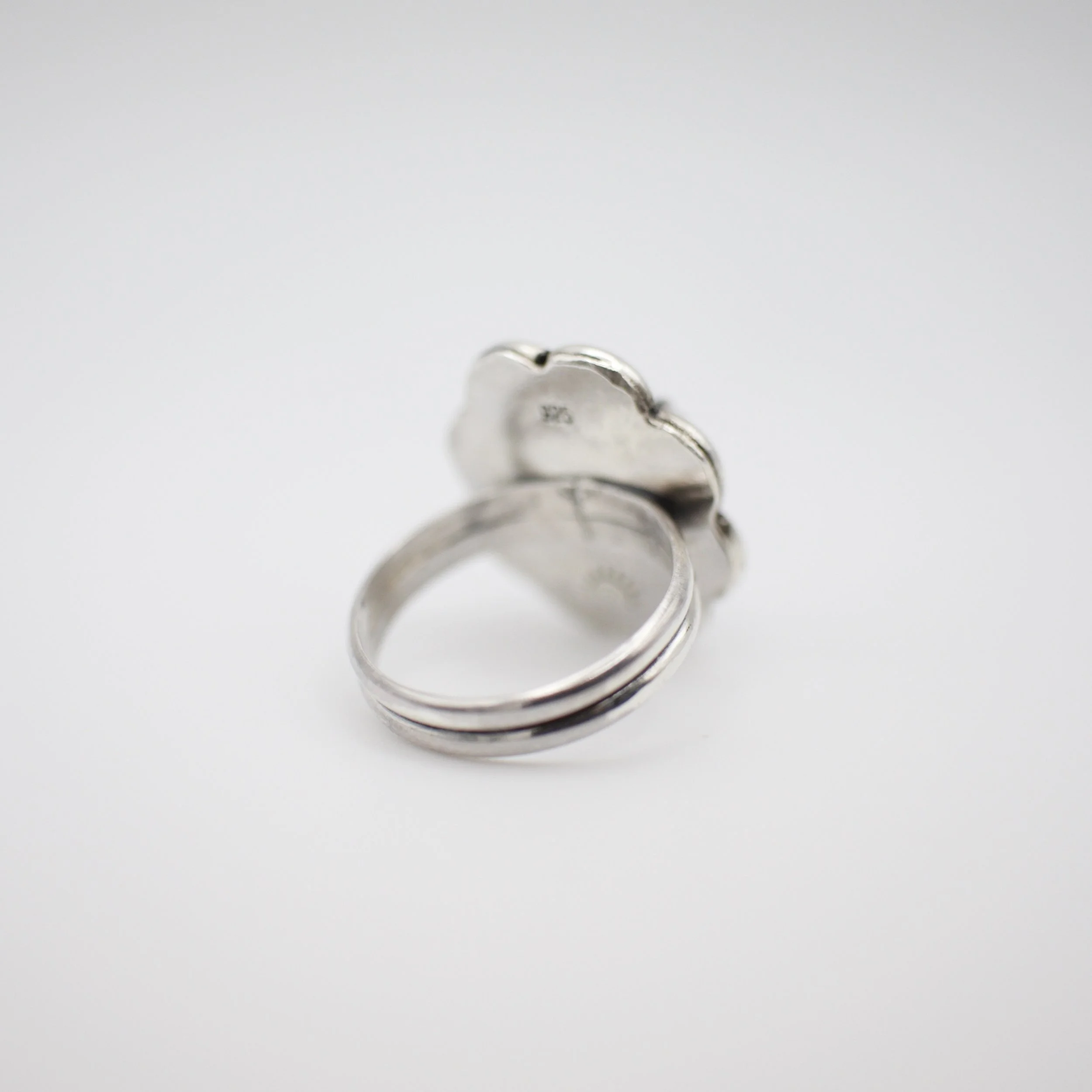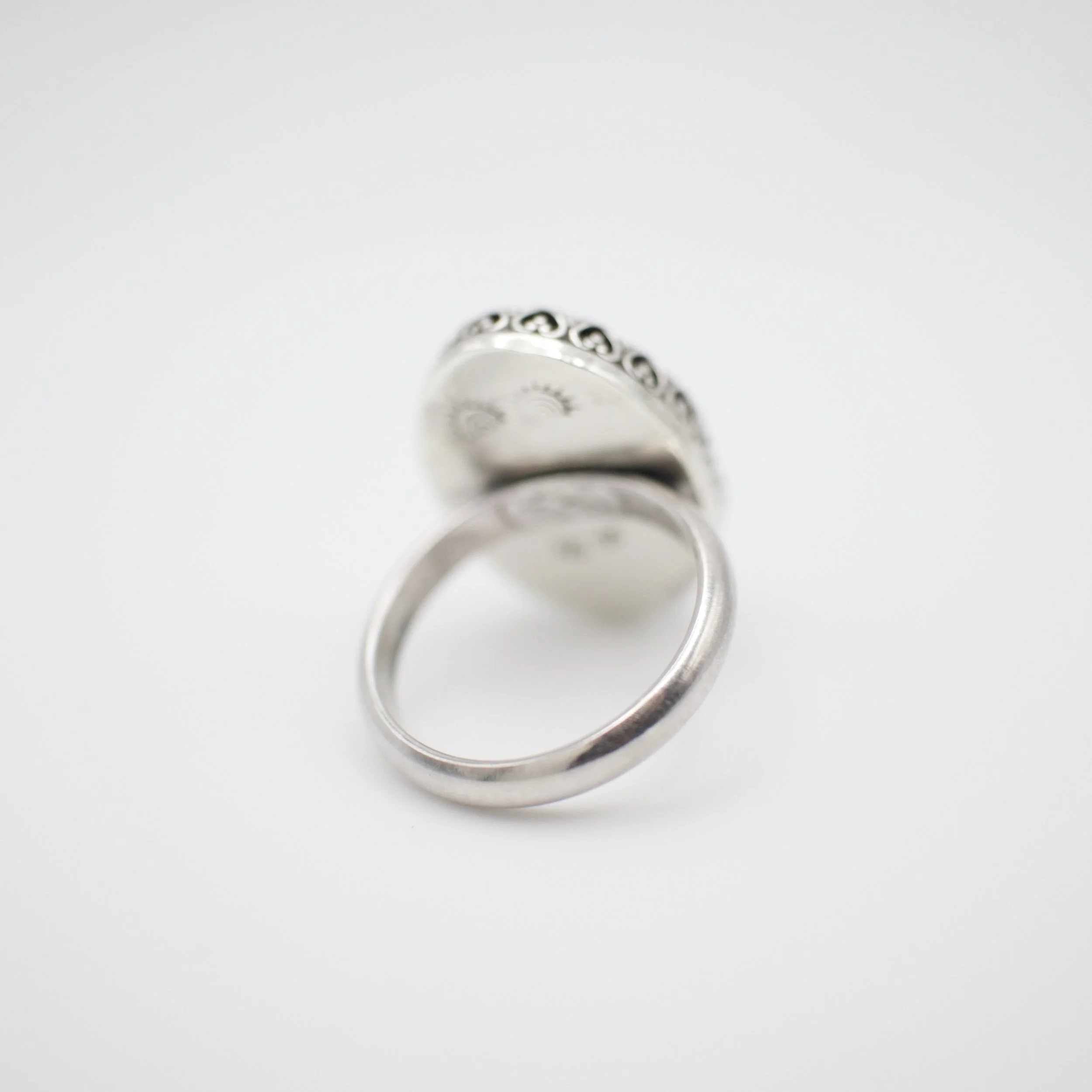 Decorative bezel around turquoise cabochon and “untextured” band in sterling silver