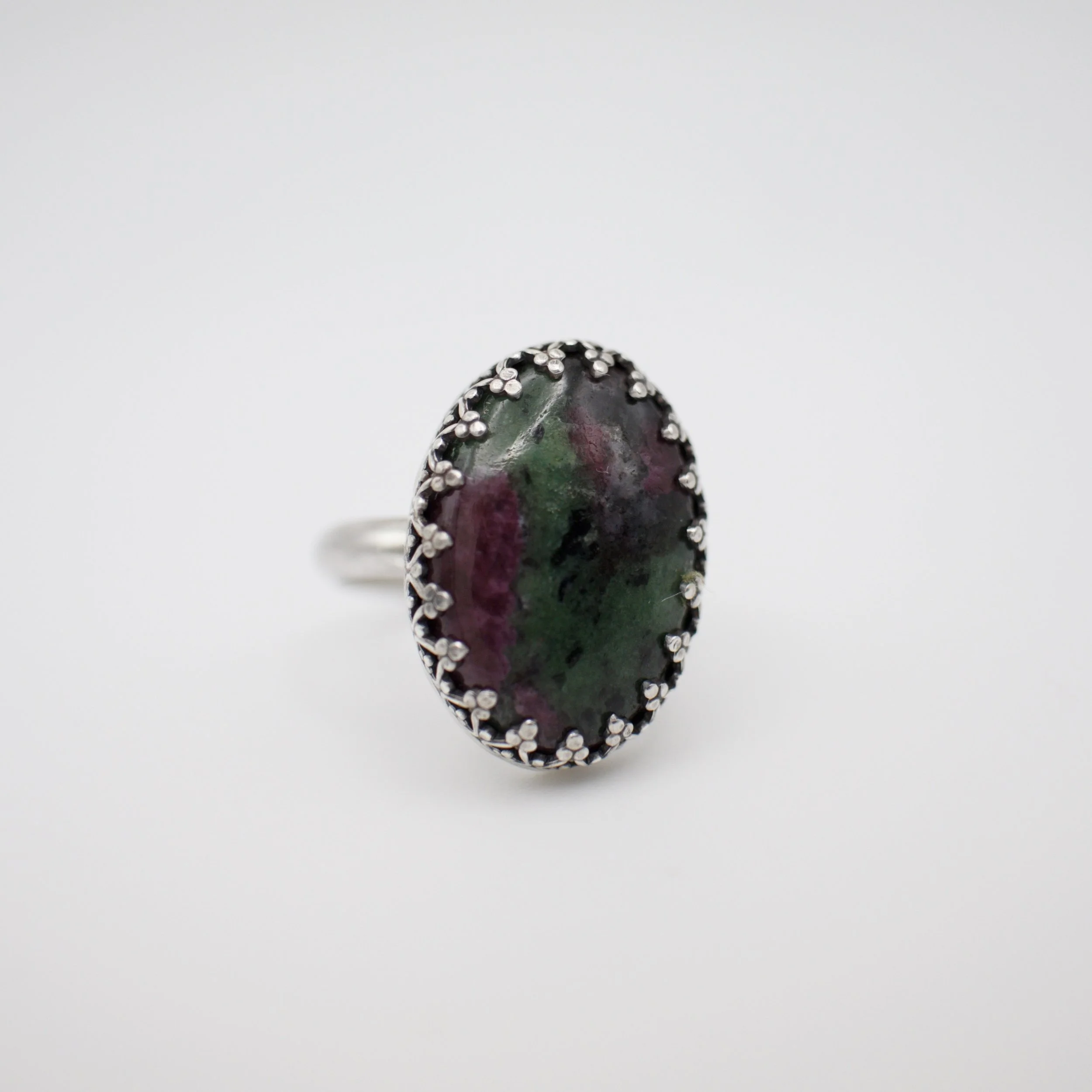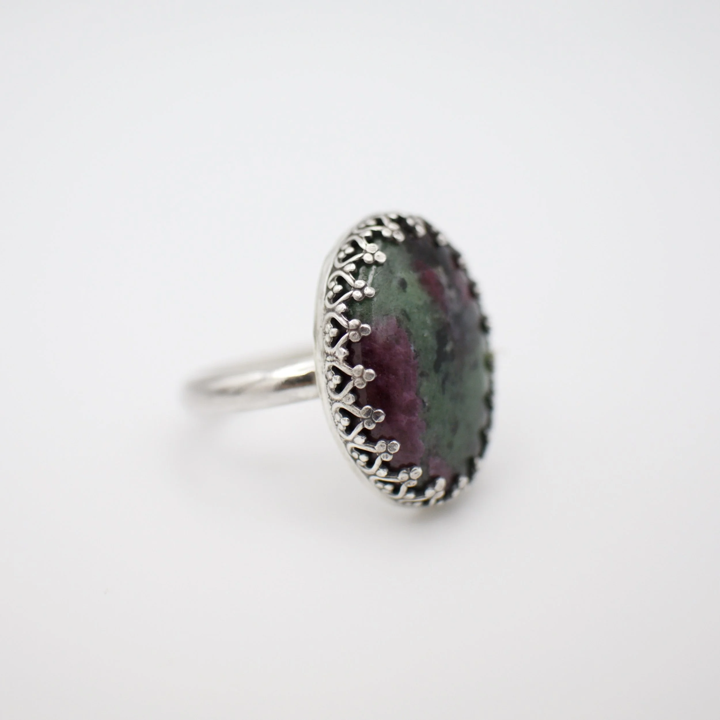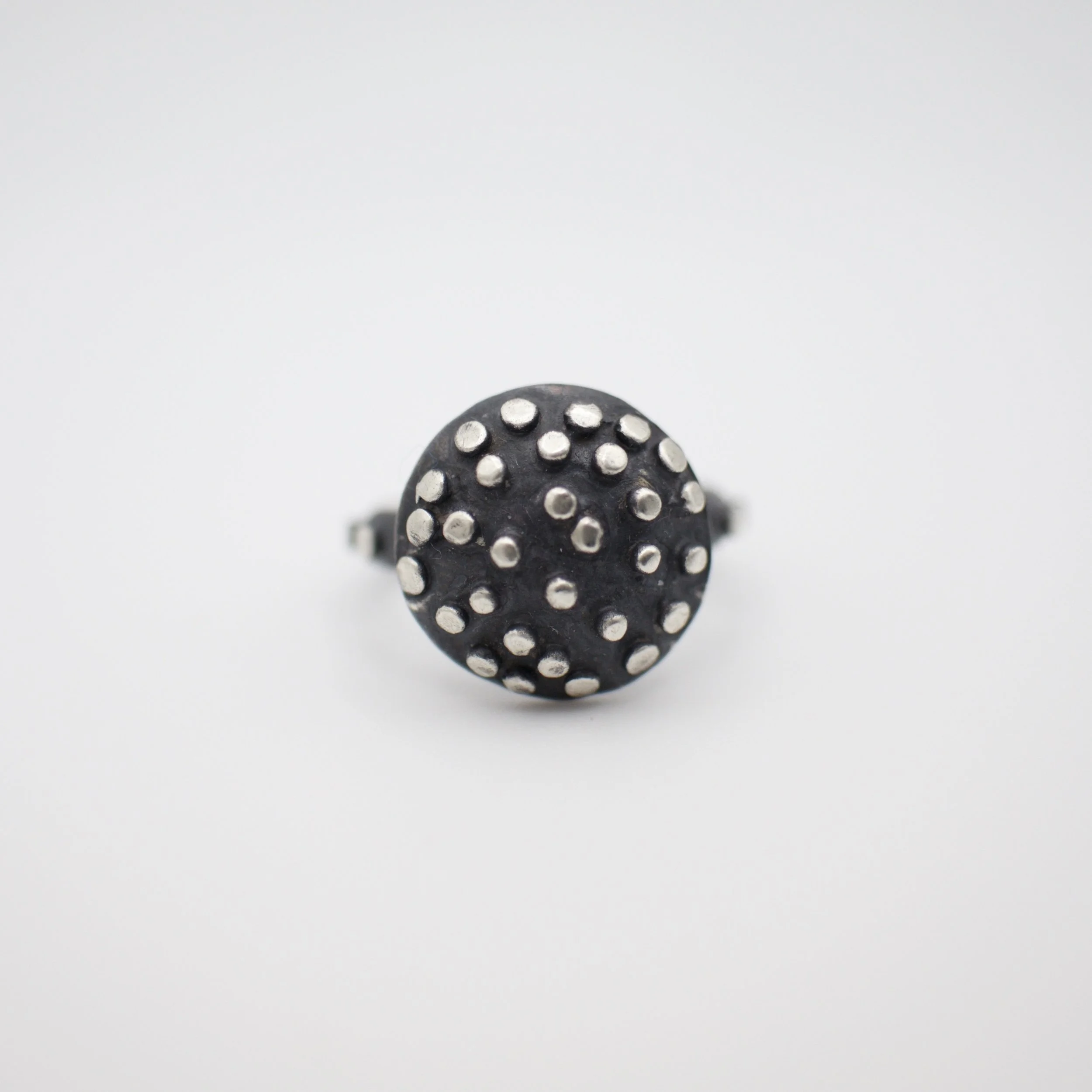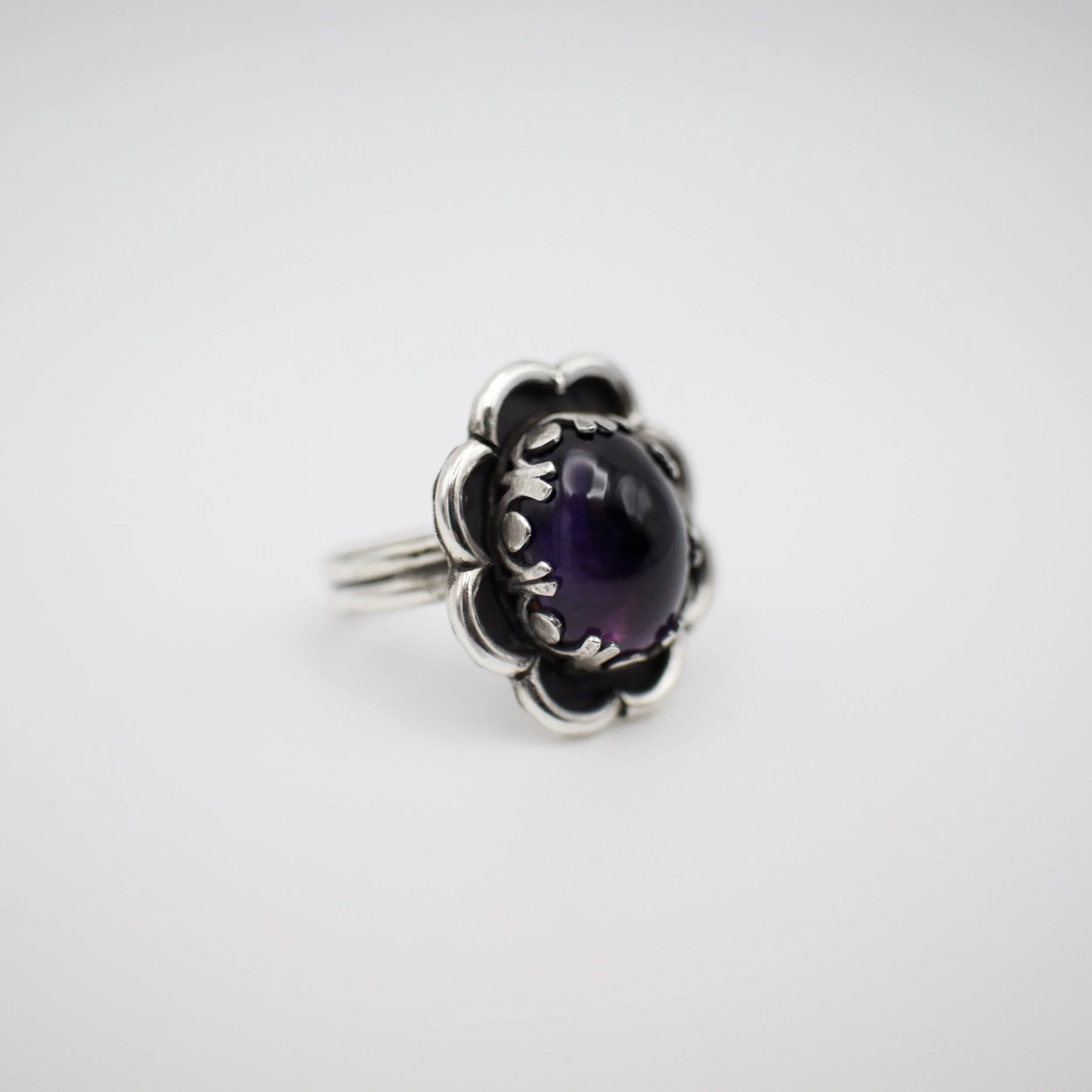 Decorative bezel around turquoise cabochon and “untextured” band in sterling silver